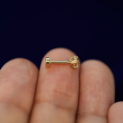 "A solid yellow gold Diamond Flatback Piercing laying facedown on a model's finger to show the end of the flat back "