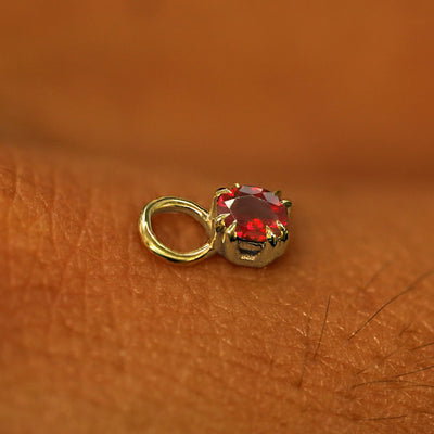 A solid yellow gold Garnet Charm for earring resting on the back of a model's hand
