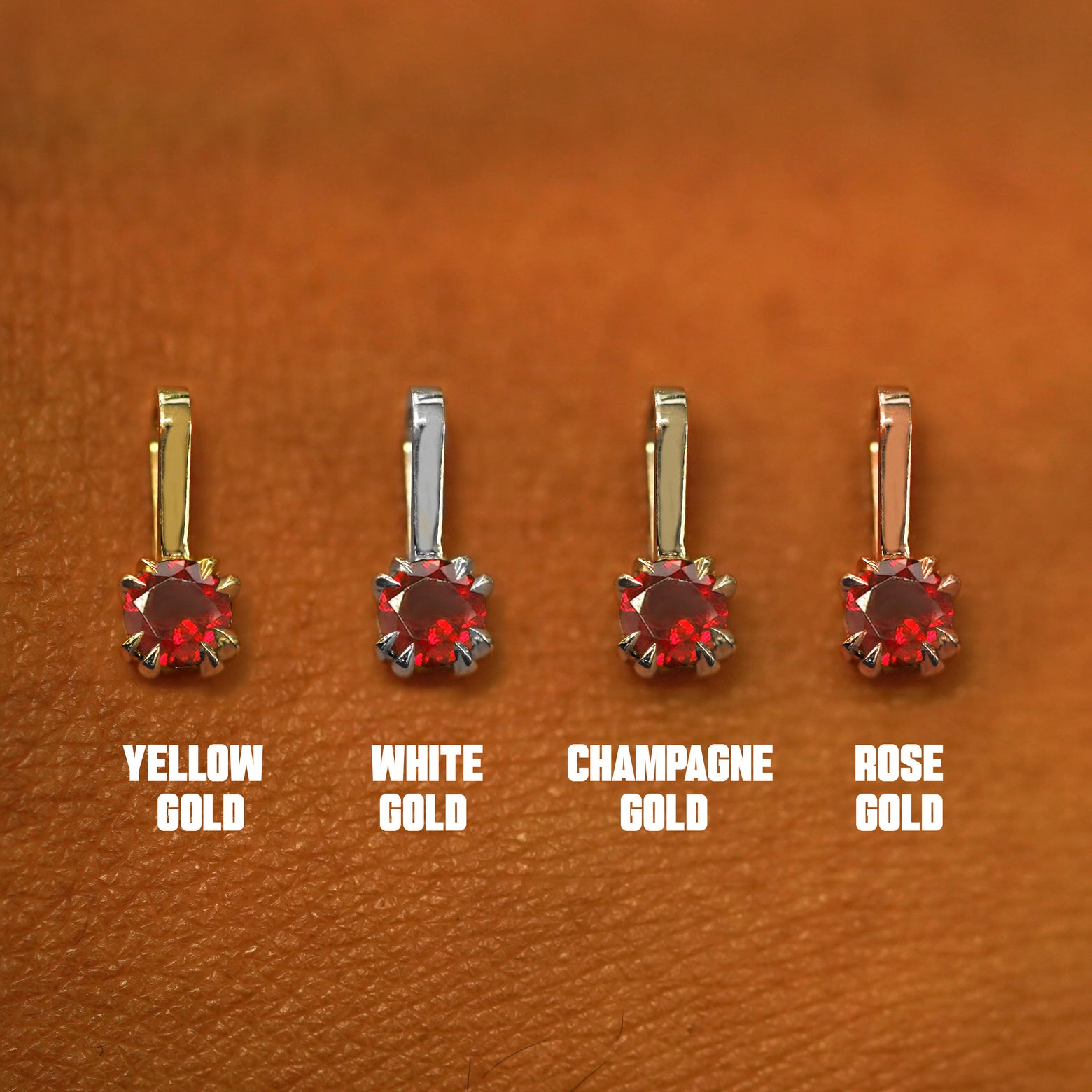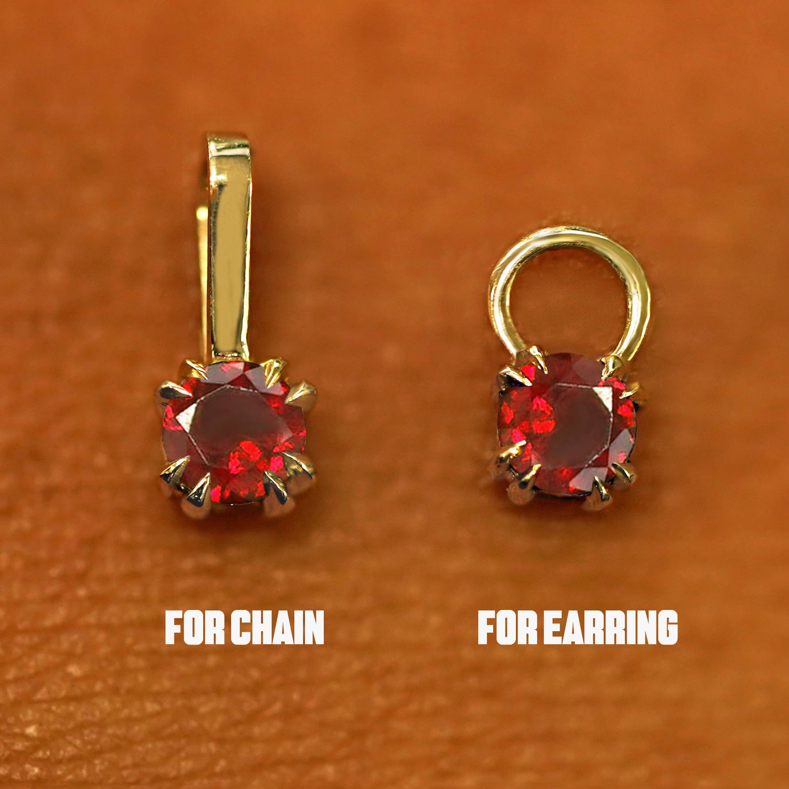 Two 14 karat solid gold Garnet Charms shown in the For Chain and For Earring options