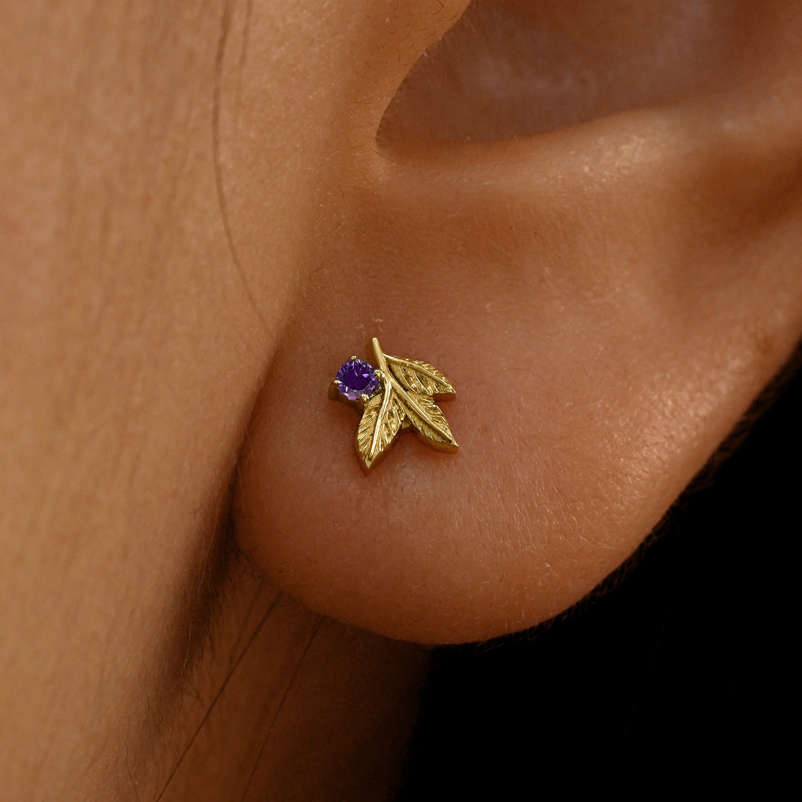 Close up view of a model's ear wearing a 14k yellow gold amethyst 3 Leaves Gemstone Earring
