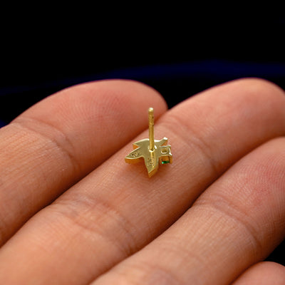 A 14k gold emerald 3 Leaves Gemstone Earring in a model's hand resting on its face to show the back of the stud and the post