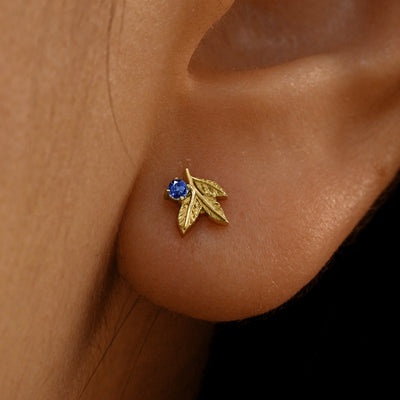 Close up view of a model's ear wearing a 14k yellow gold blue sapphire 3 Leaves Gemstone Earring
