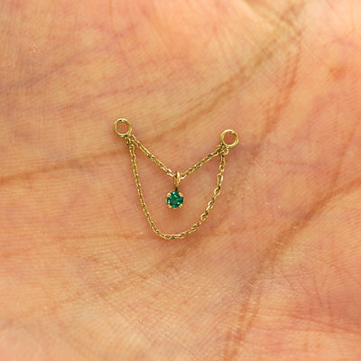 Close up view of a model's ear wearing a yellow gold emerald Cable Chain Connector across two Circle Studs behind their lobe