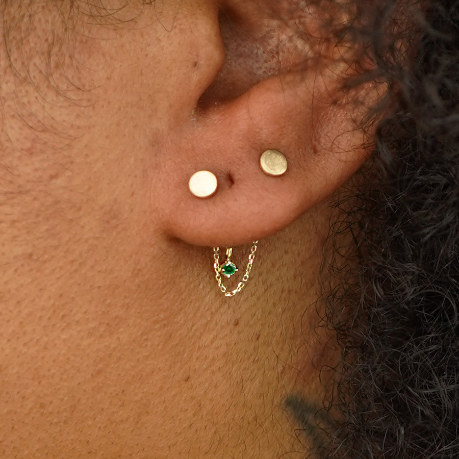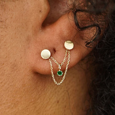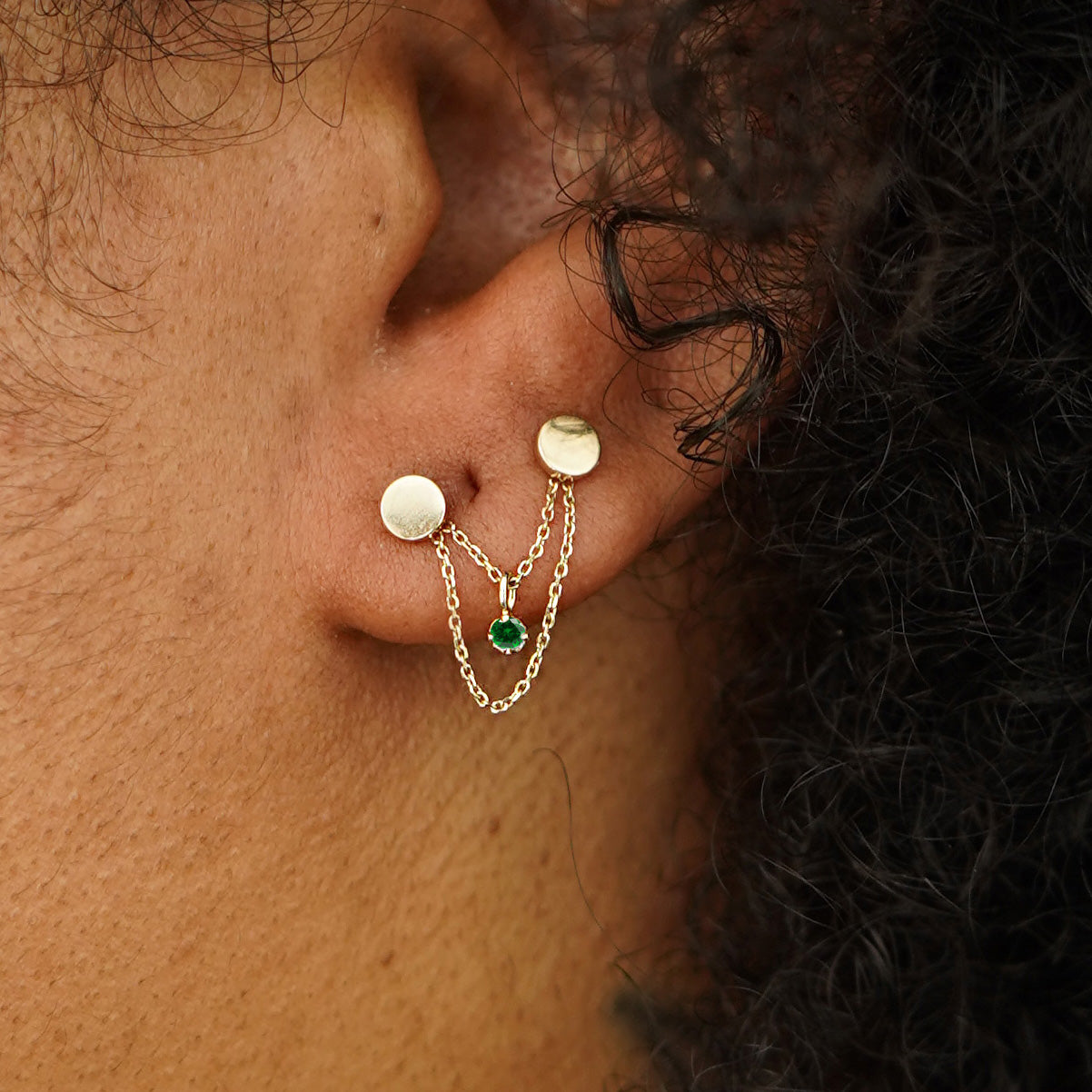A model's ear wearing a yellow gold emerald Cable Chain Connector across two Circle Studs on their lobe