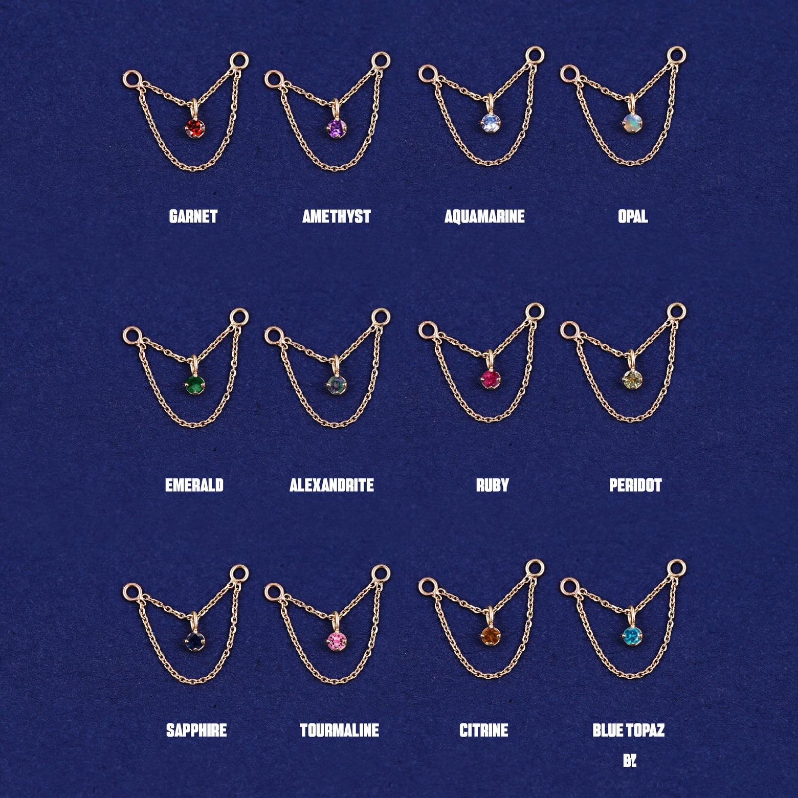 Twelve versions of the solid yellow gold Gemstone Cable Chain Connector showing the different stone options