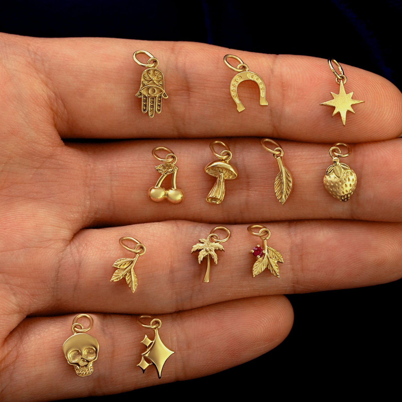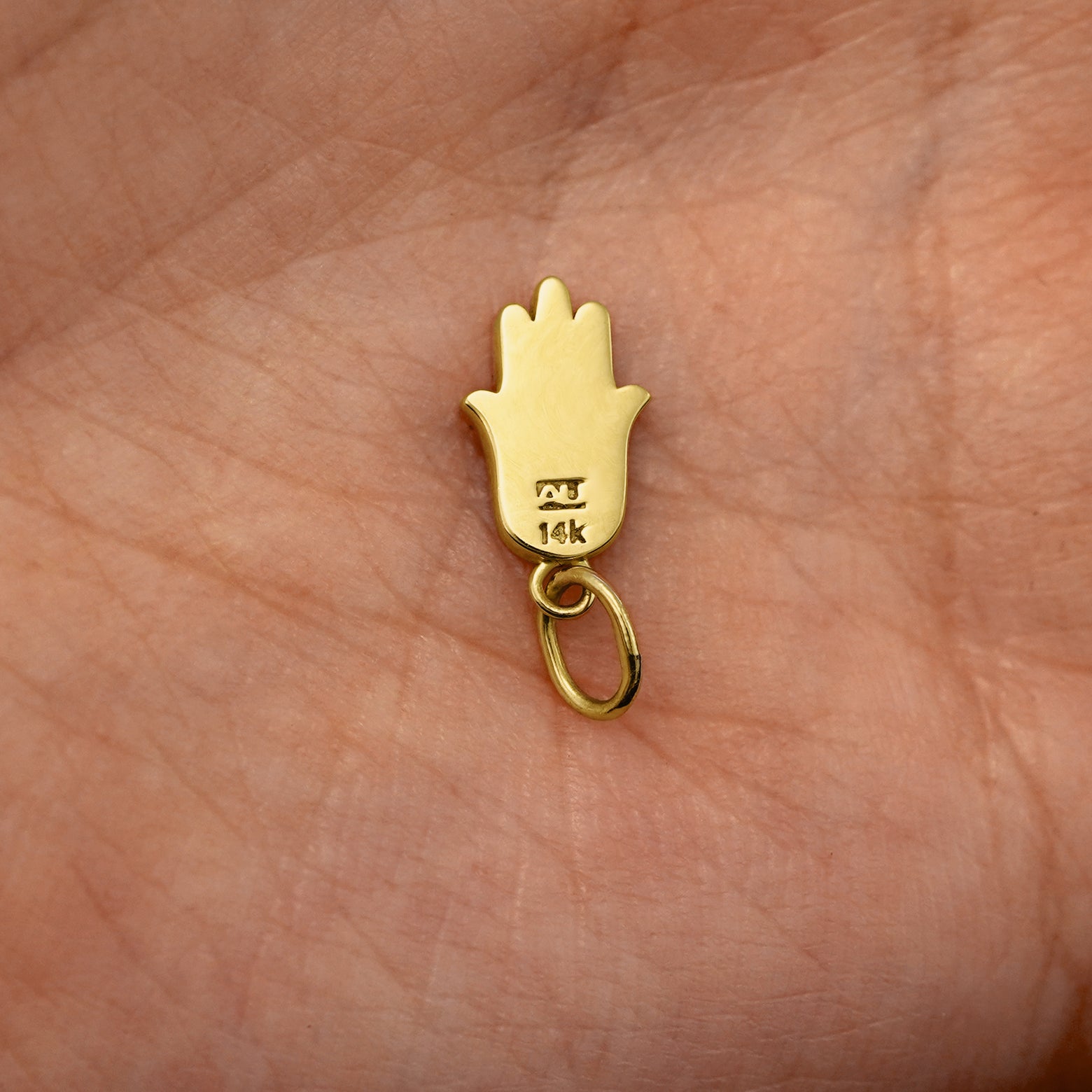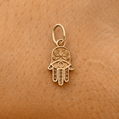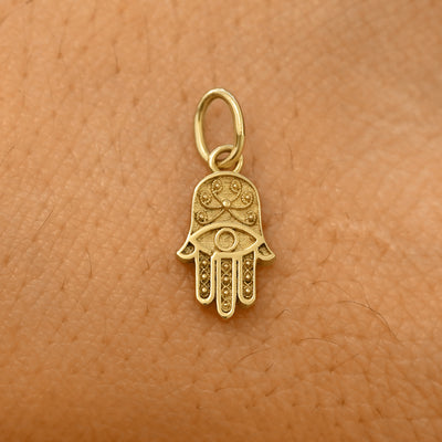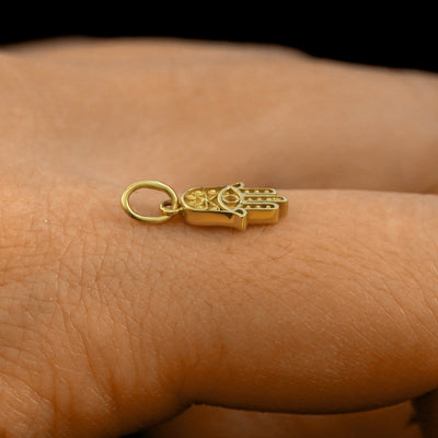 A solid 14k yellow gold Hamsa Charm resting on the back of a model's hand