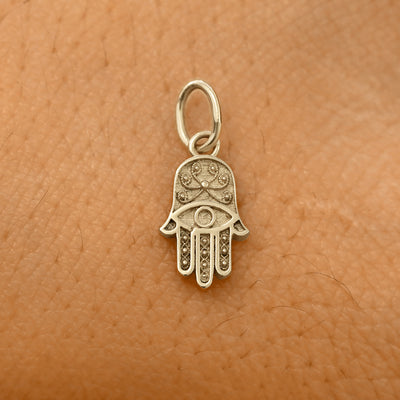 The Hamsa is a symbol of protection, power, and strength for many different cultures. Our Hamsa charm is crafted from recycled solid 14k gold and features an eye symbol in the center of the hand to protect against the evil eye and filigree-style swirls and infinity symbols to represent life.