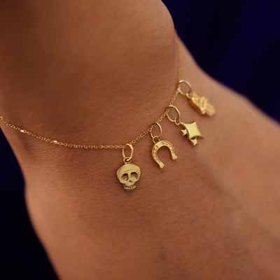 Close up view of a model's wrist wearing skull, horseshoe, sparky emoji, and hamsa charms on a cable bracelet