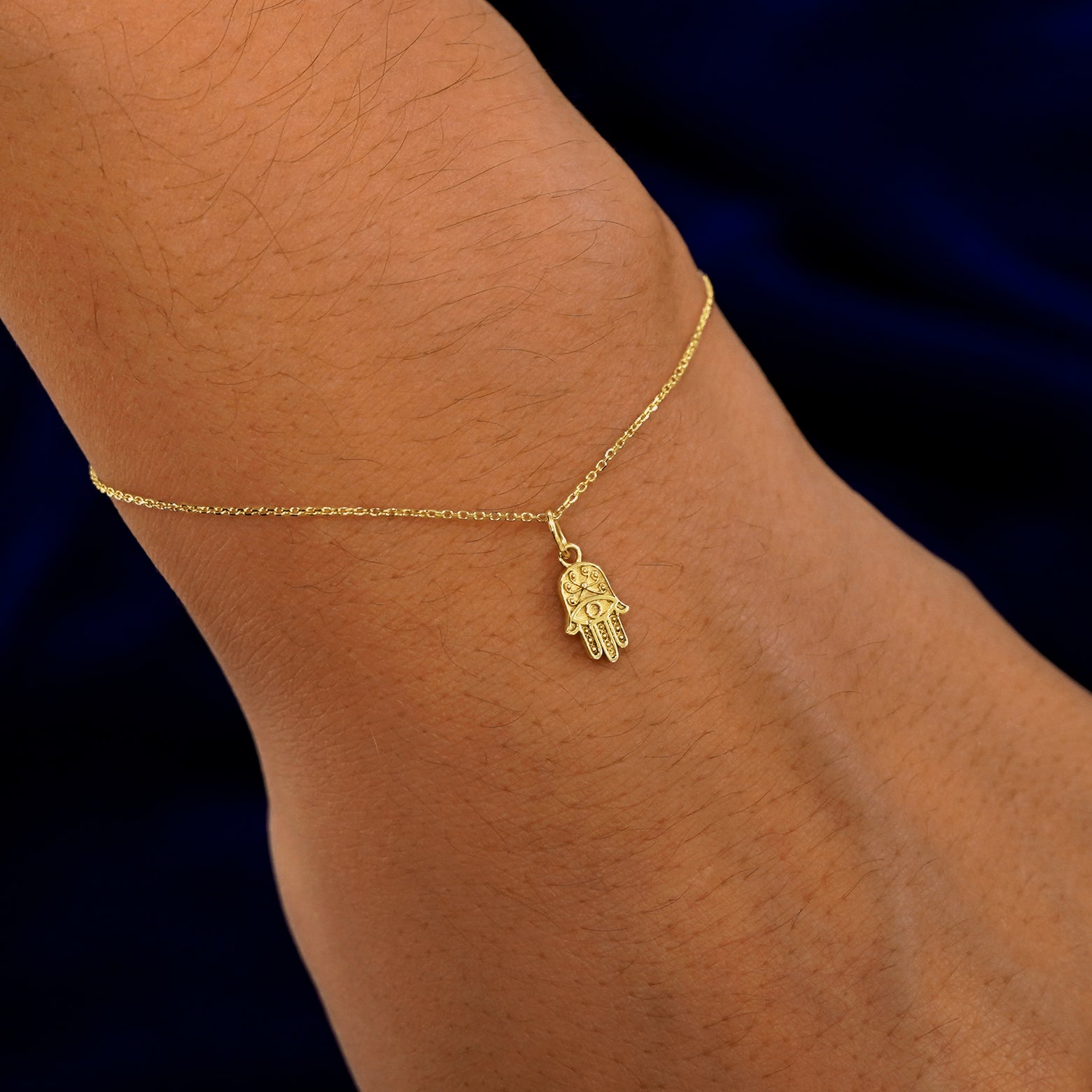 A model's wrist wearing a yellow gold Hamsa evil eye charm on a Cable Bracelet