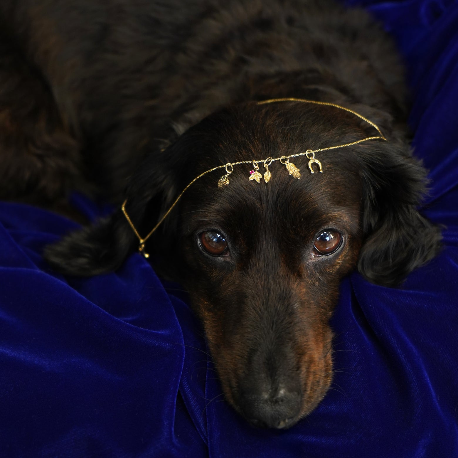 A 14k gold cable chain with a horseshoe, hamsa, leaf, strawberry, and gemstone 3 leaf charm on top of Luna's head