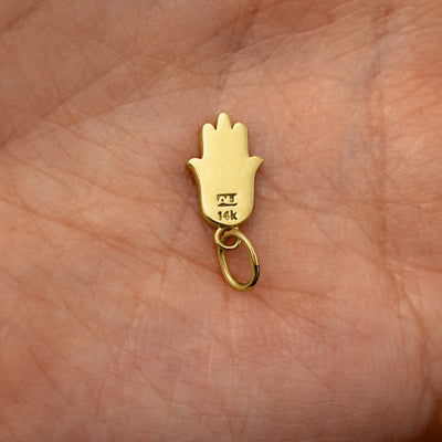 Back view of a solid 14k yellow gold Hamsa Charm resting on in the palm of a model's hand
