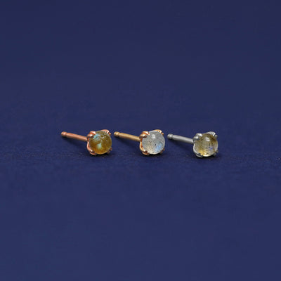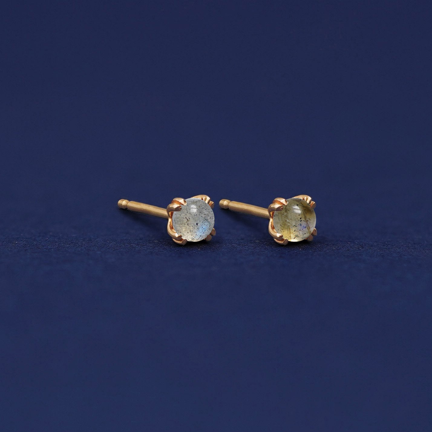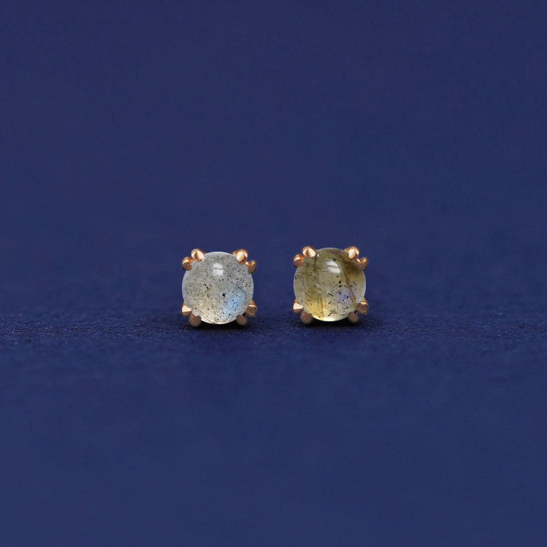 These incredible cabochon gemstone earrings are truly unique. Each labradorite stud is like a self-contained galaxy. Wear these stunning 14k solid gold earrings everywhere.