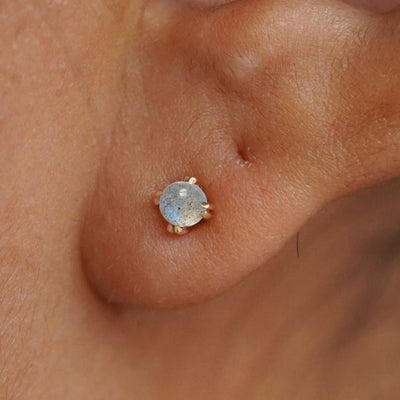 A model's ear wearing a solid yellow gold Labradorite Earring