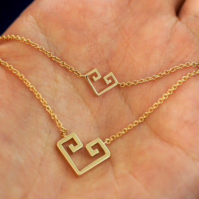 A 14k gold large geometric heart necklace resting on a model's fingers