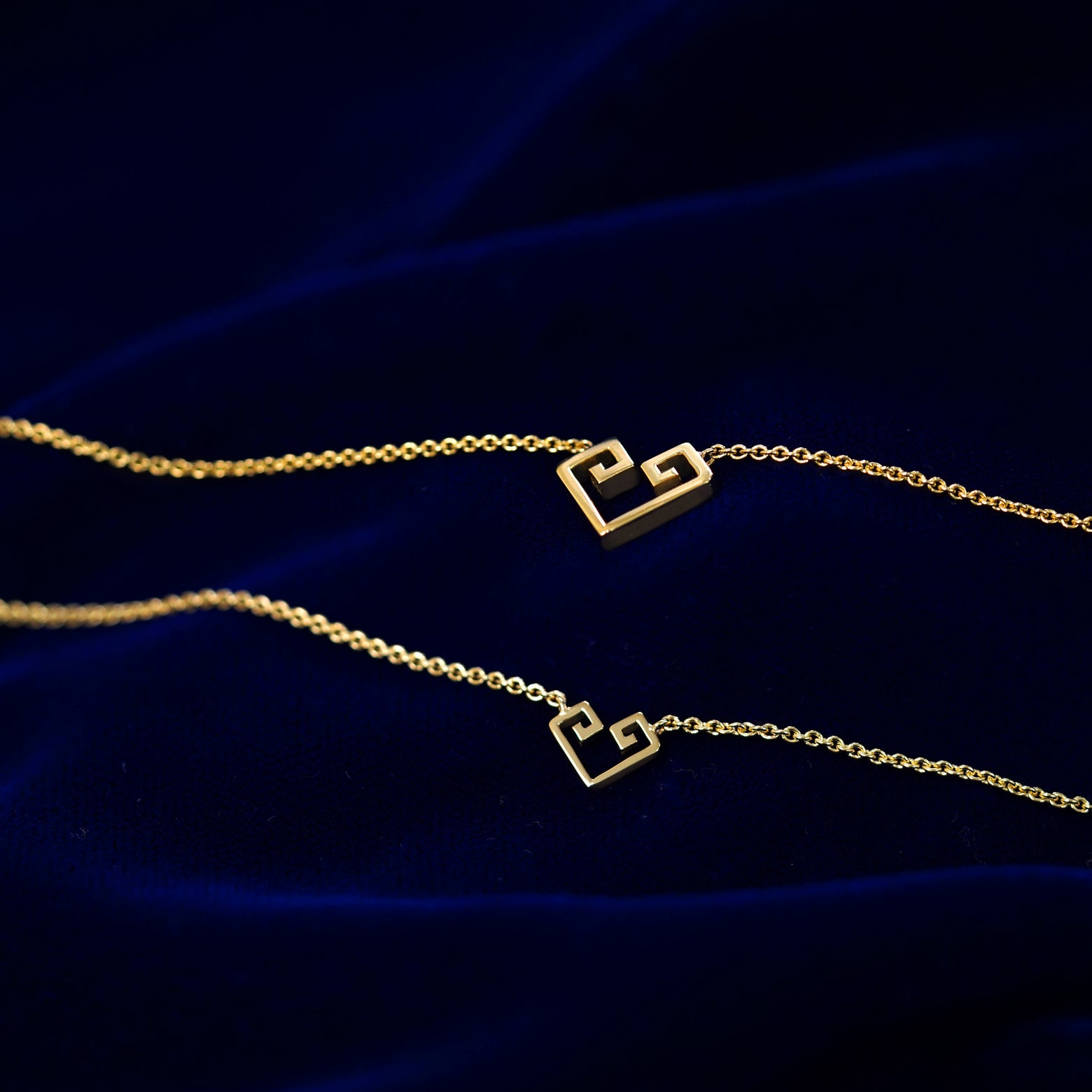Small and large geometric heart pendant necklaces layered on a dark blue cloth