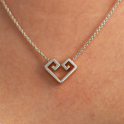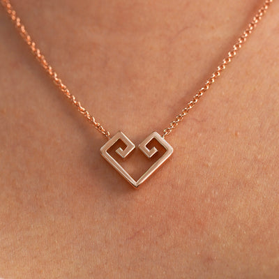 This stunning geometric heart necklace features angular spirals at the top of the heart. The thick solid gold pendant is attached to a thick cable chain which has our easy-to-grip AU plate and secures with a lobster claw clasp. This androgynous heart necklace is designed to be worn by everyone, a piece that completes every look. The Chere heart is based on the Chavash symbol for loyalty, love, and unity.