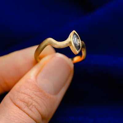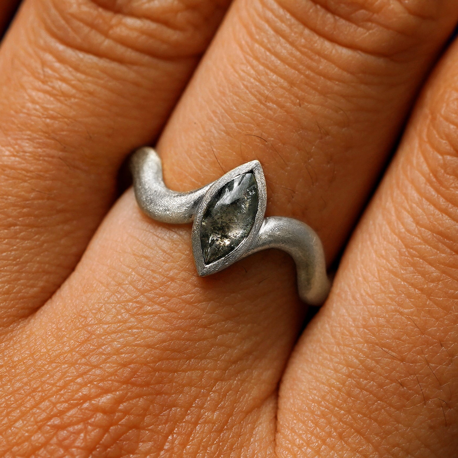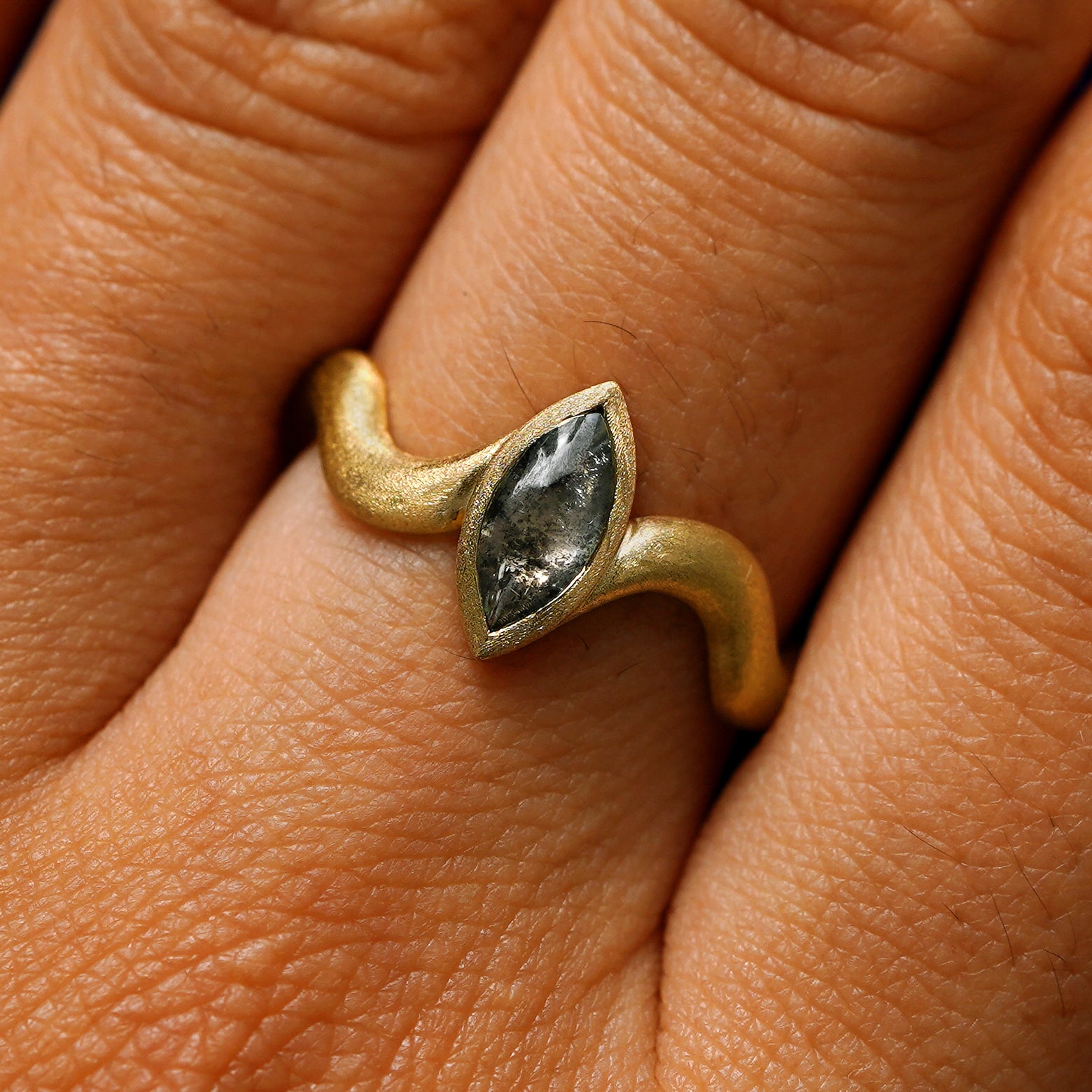 Salt and pepper diamonds look like tiny galaxies, so we paired this marquise cabochon diamond with our sparkling stardust finish for a truly ethereal look. Without a cutout behind the stone, the light comes in from the top of the domed cabochon and reflects within the stone, creating the illusion of a mystical portal.  The bezel setting and waved band create a gorgeous visual effect, but the band straightens at the back for a comfortable wearing feel.