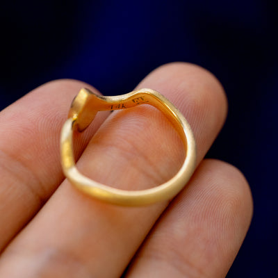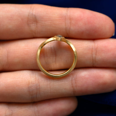 A solid gold marquise cabochon salt and pepper diamond ring on a model's fingertips showing the inside of the band