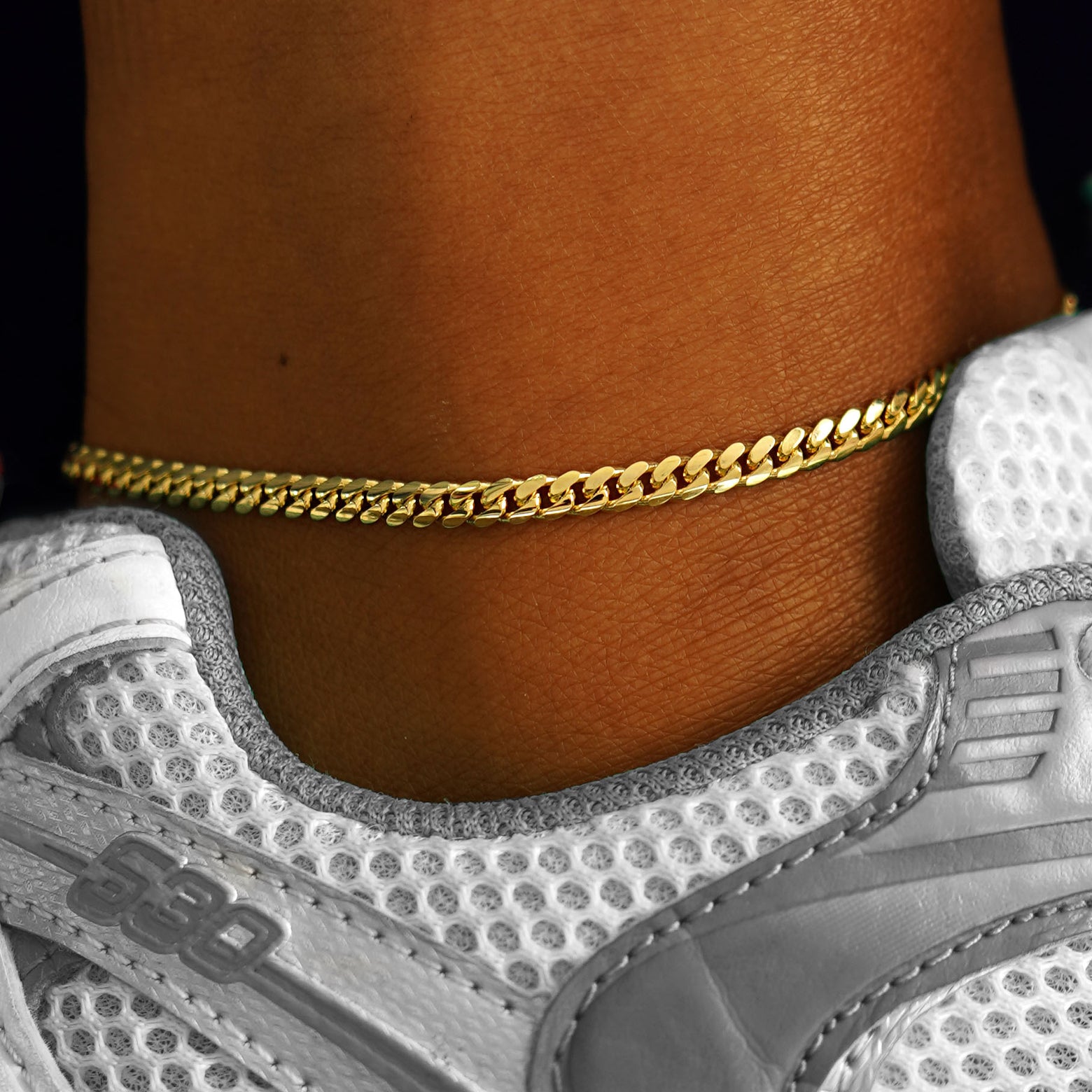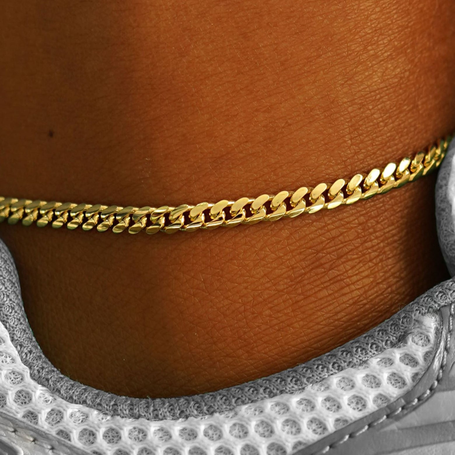 A close up view of model's ankle wear a 14k yellow gold Medium Miami Anklet
