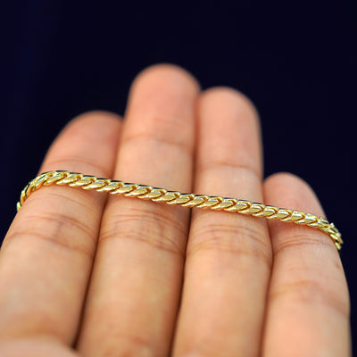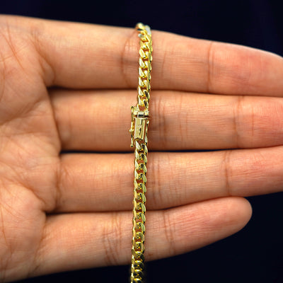 A model's hand holding a yellow 14k gold Medium Miami Anklet with a box clasp