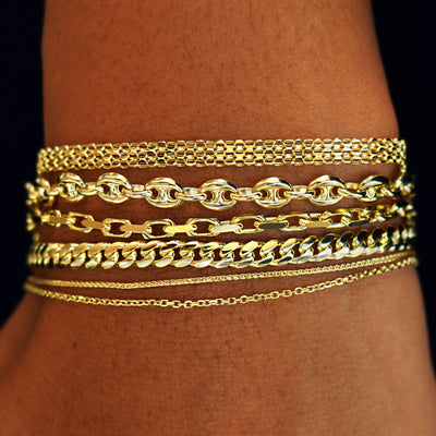 A model's wrist wearing yellow gold Bismarck, Anchor, Anchor, Medium Miami, Wheat, and Medium Cable Bracelets