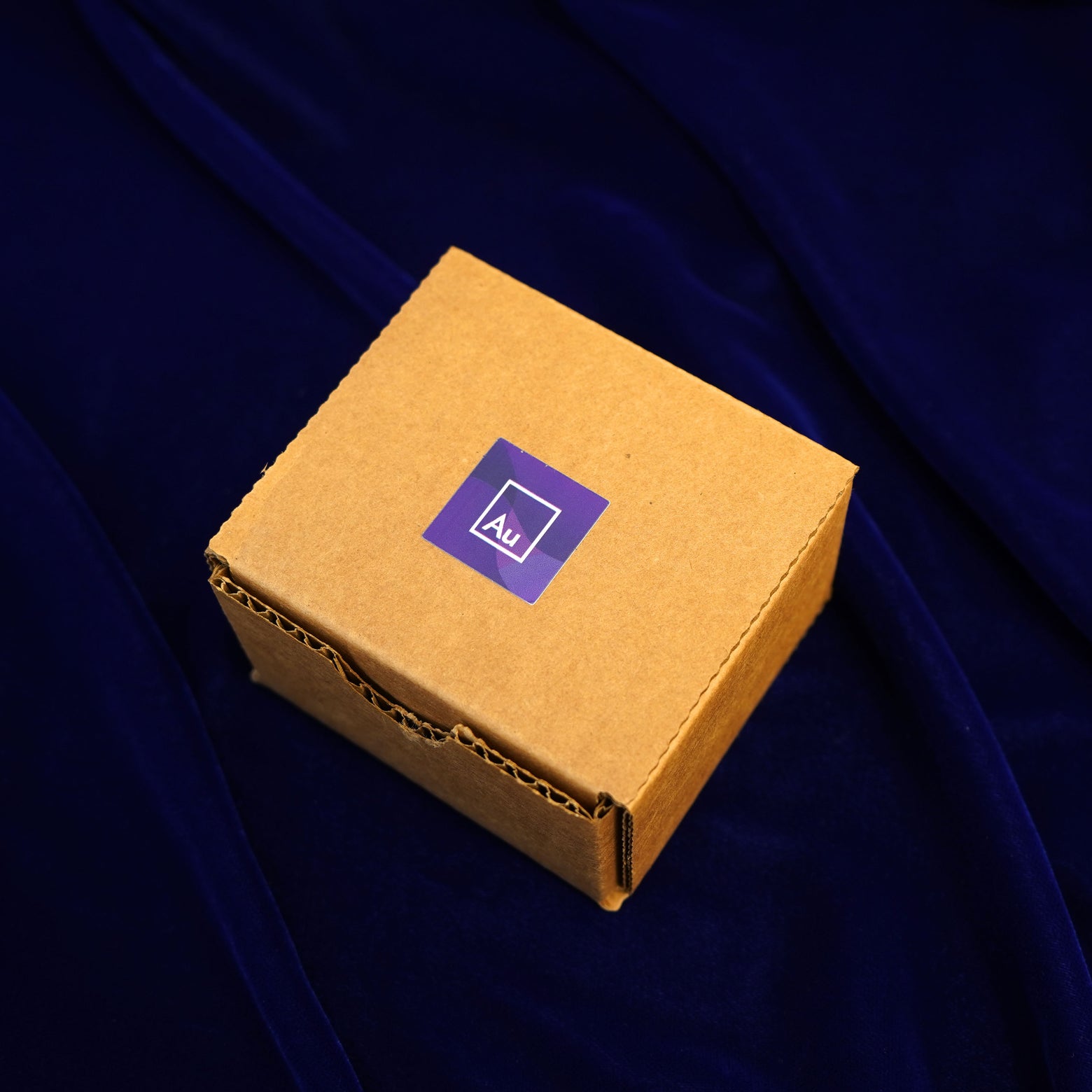 A closed Automic Gold Minimal Packaging box on a dark blue background