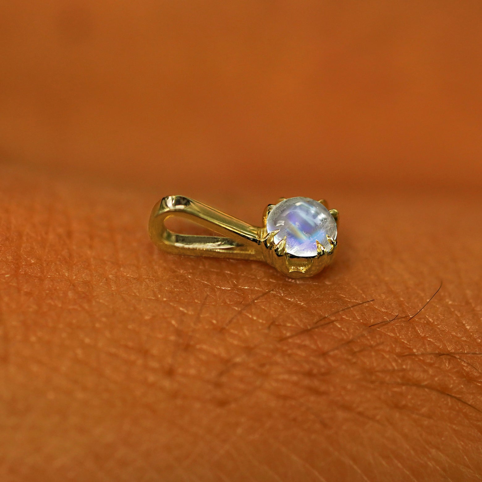 Like a tiny water droplet you can wear everywhere, this dainty cabochon Moonstone charm is truly beautiful. This piece of June birthstone jewelry makes a great little addition to your chain, bracelet or hoop earrings. Wear our gemstone charms as layered pendant necklaces to add bold style and color to your look.