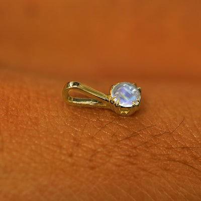 A solid gold Moonstone Charm for earring facedown on a model's fingertip to show the solid back of the charm