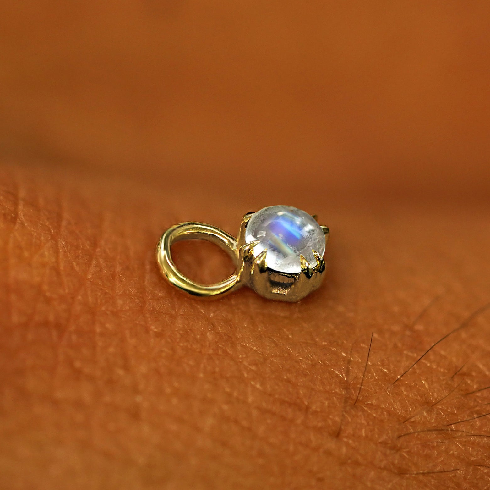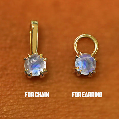 Two 14 karat solid gold Moonstone Charms shown in the For Chain and For Earring options