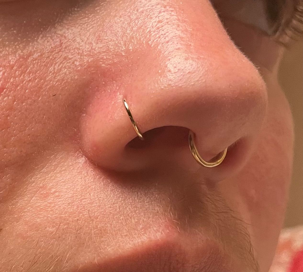 Close up view of a model's nose wearing a 14k rose gold Nose Ring Hoop