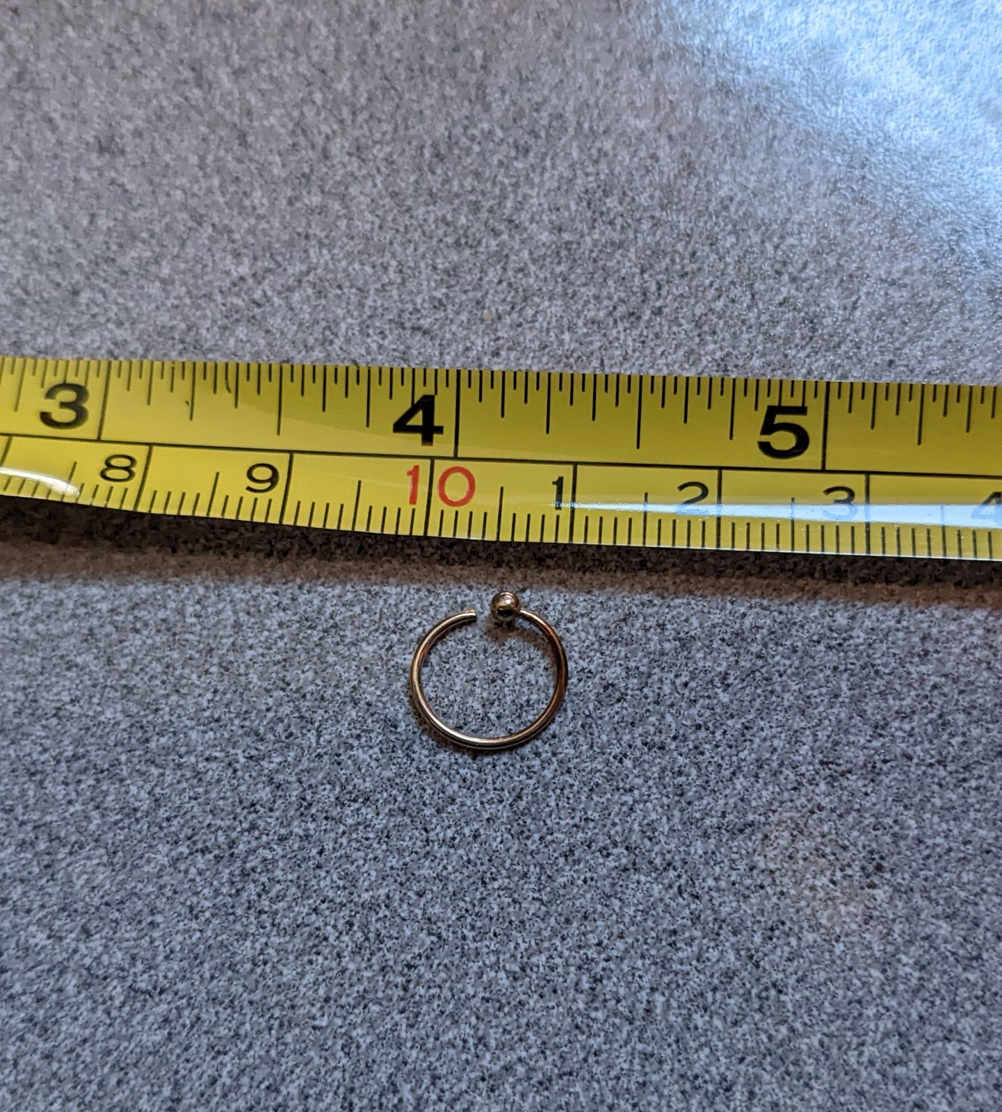 To find your size, measure the space between your piercing and the end of the nose. Choose the size closest to the measurement. Nose ring can be adjusted slightly.