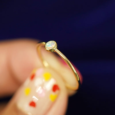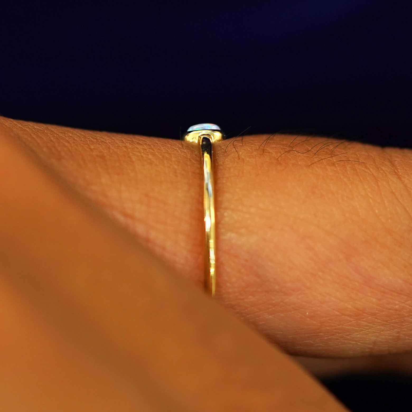 A model holding a 14k gold Opal Ring between their fingers to show the details of the bezel set stone