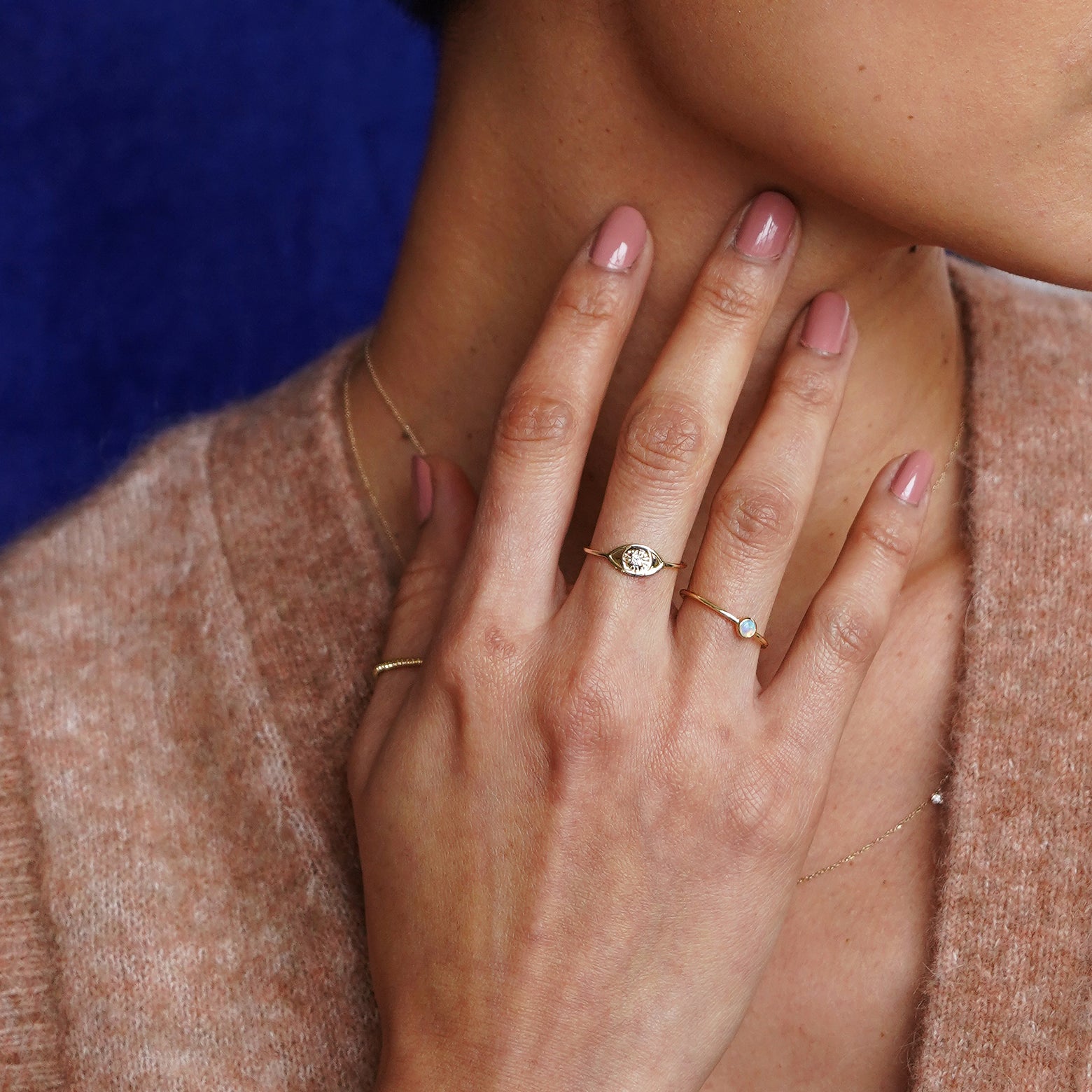 A model touching their neck wearing a Diamond Evil Eye Ring, a Rope Ring, and an Opal Ring
