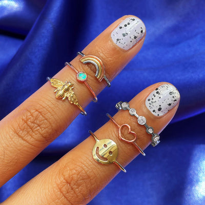 Two fingers with speckled nail polish wearing various Automic Gold rings including a rose gold Opal Ring