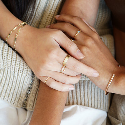 Two models touching each others hands over one model's arm while wearing various Automic Gold jewelry