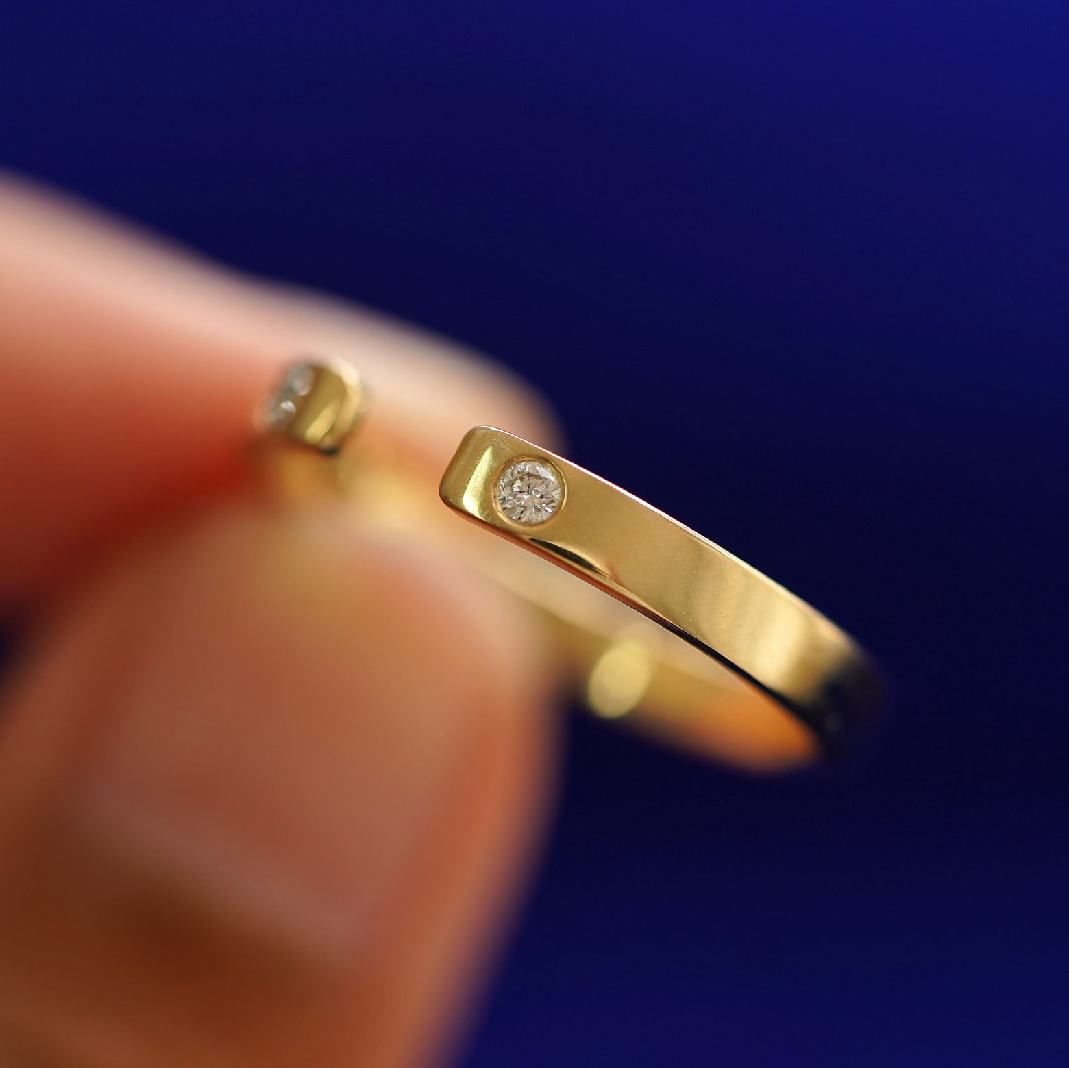 This breathtaking wedding band features two glittering diamonds set flush into the open ends of the comfort fit industrial solid gold or platinum band. A gorgeous genderless diamond wedding ring that is perfect when worn alone but has space to showcase an engagement ring when stacked.