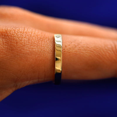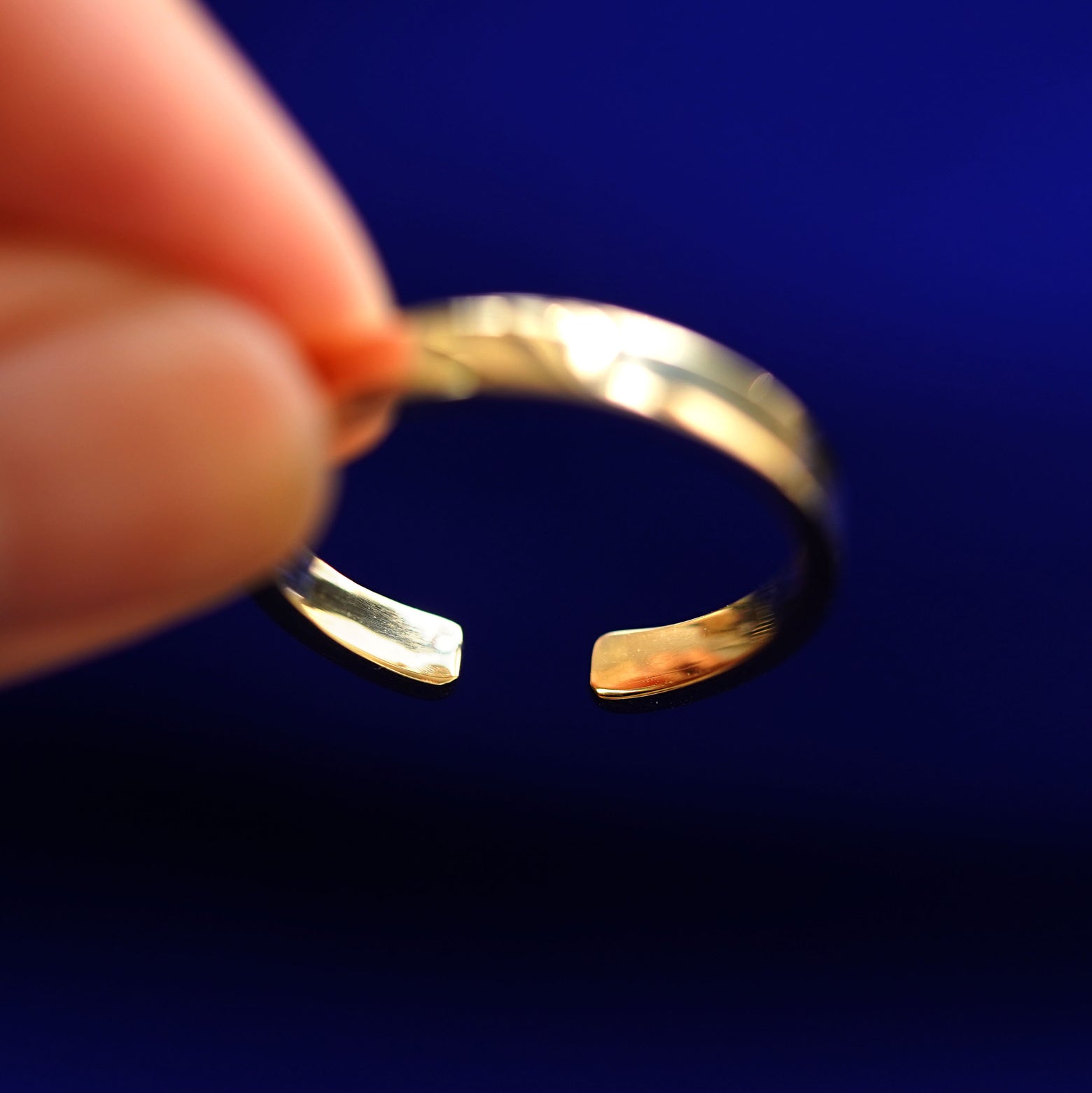 Close up view of a model's fingers wearing a 14k champagne gold Open Industrial Band