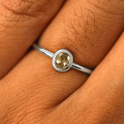Close up view of a model's fingers wearing a 14k white gold Oval Champagne Diamond Ring