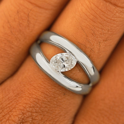 Close up view of a model's fingers wearing a 14k white gold Oval Lab Diamond Tension Ring