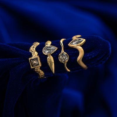 Four engagement rings with different shapes of cabochon salt and pepper diamonds stacked sideways on a blue cloth