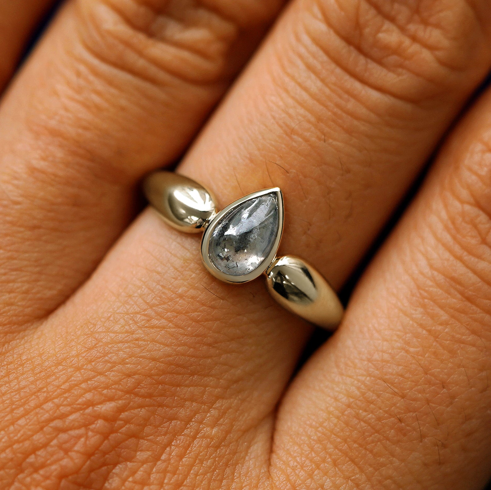 They’ll be crying tears of joy when you propose with this gorgeous teardrop diamond ring. A stunning pear-shaped cabochon salt and pepper diamond is bezel set in solid 14k gold or 950 platinum. There is no cutout behind the stone so all the light comes in from the top of the domed cabochon, creating an ethereal glowing sheen. The diamond is flanked by a pair of golden teardrops on the side that taper to form the band.