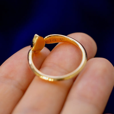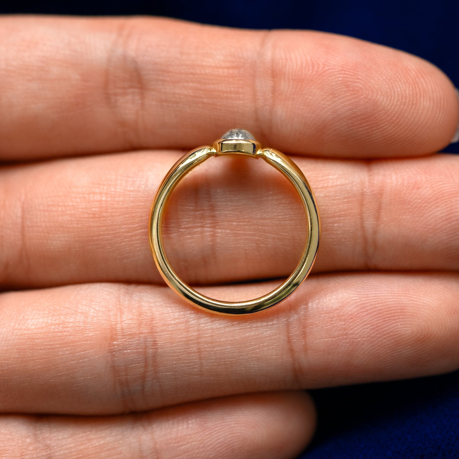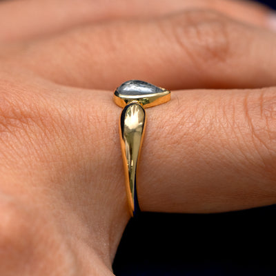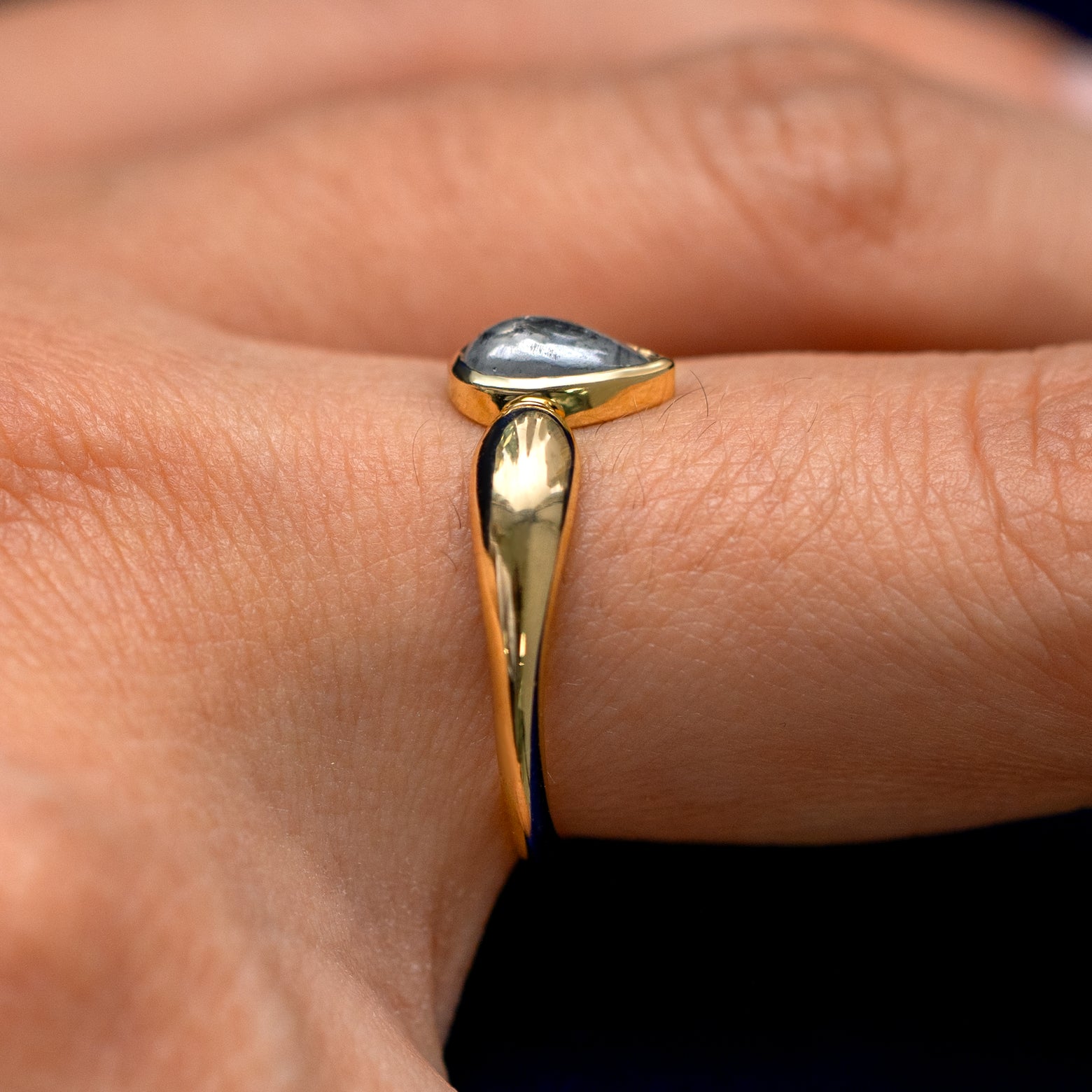 A solid gold pear cabochon salt and pepper diamond ring on a model's fingertips showing the inside of the band