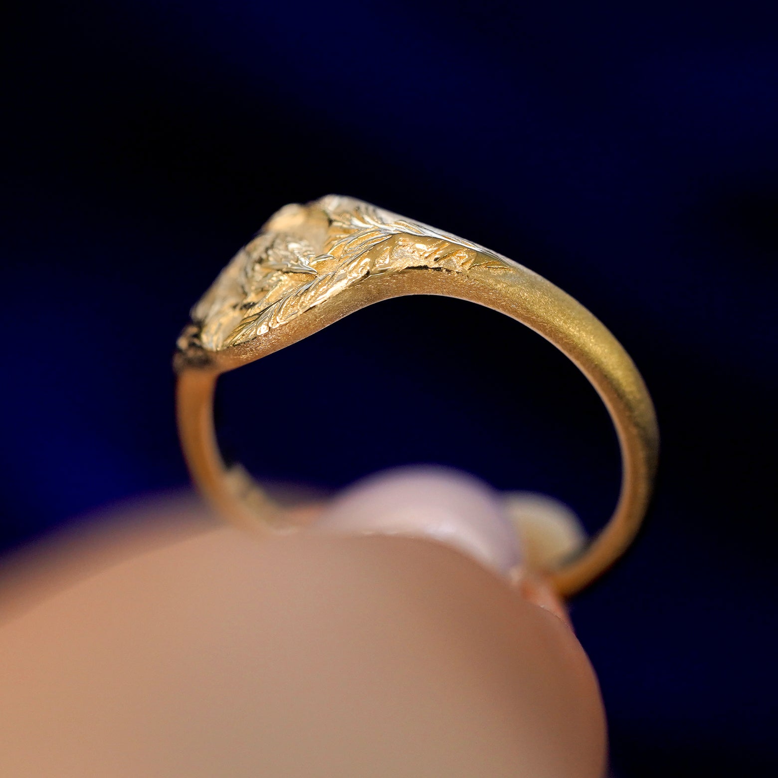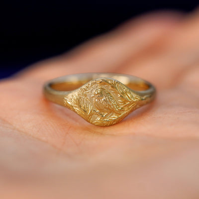 Close up view of a model's fingers wearing a 14k champagne gold Pine and Bird Signet Ring