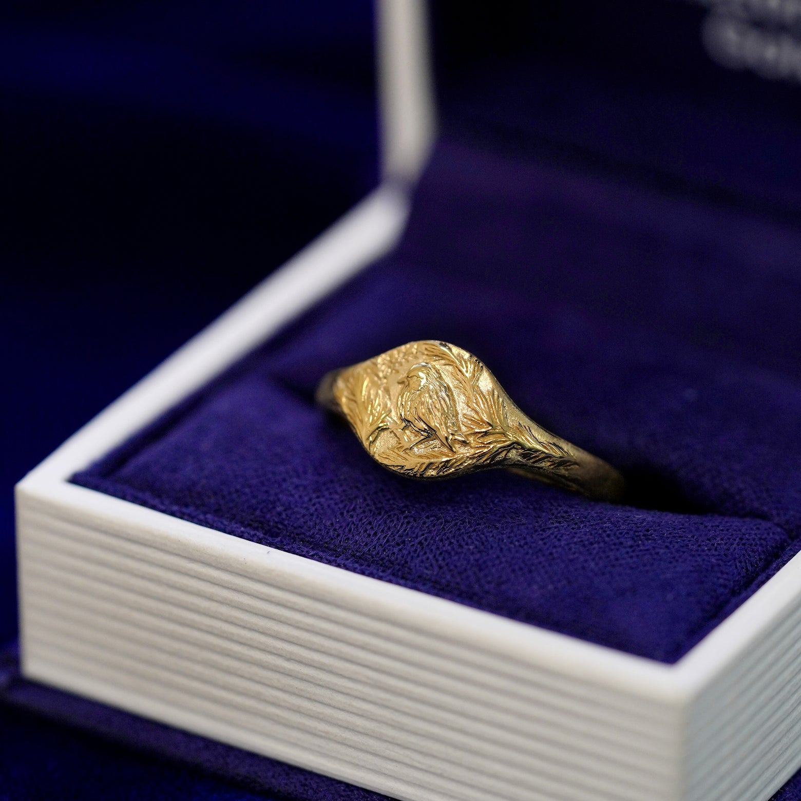 This gorgeous signet ring was designed to be an engagement ring for people who want a genderless and unique piece without stones. This ring depicts a highly polished bird surrounded by pine tree branches that extend into the band. The background to the scene, as well as the outward face of the band, have a matte finish to create a striking contrast and to mimic a snowy texture.