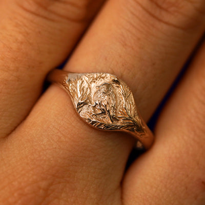 Close up view of a model's fingers wearing a 14k rose gold Pine and Bird Signet Ring