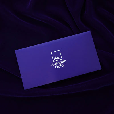 An Automic Gold branded envelope containing a polishing cloth sitting on a dark blue background