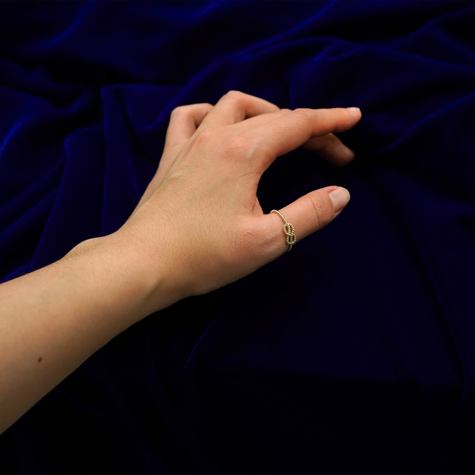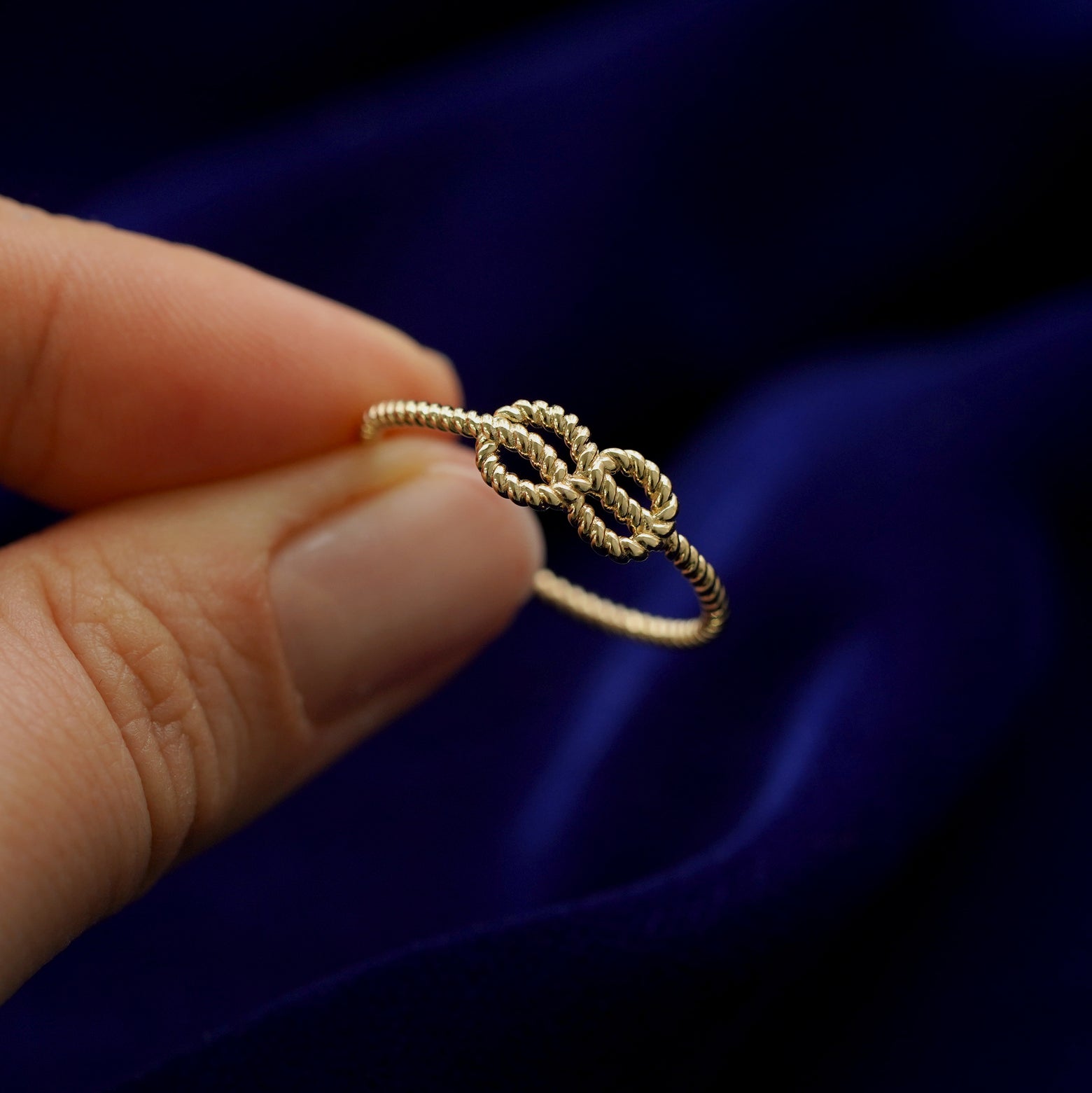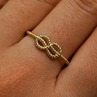 A model holding a 14k gold rope infinity Ring upright to show the thickness of the band