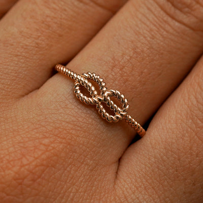 Close up view of a model's fingers wearing a 14k rose gold Rope Infinity Ring
