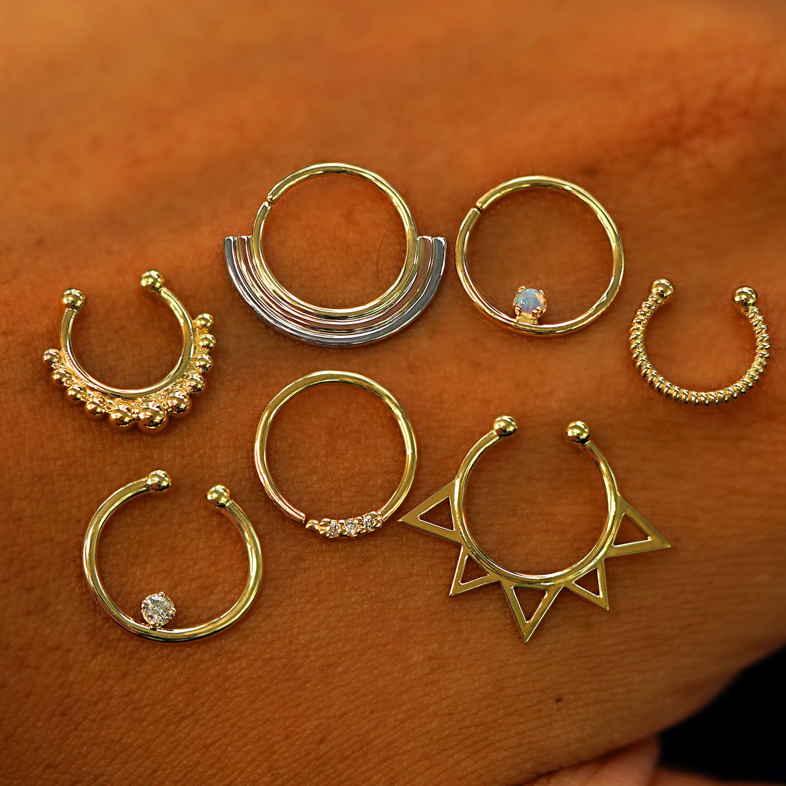 A beaded, rainbow, raised gemstone, rope, raised diamond, triple diamond, and sun septum rings on the back of a model's hand