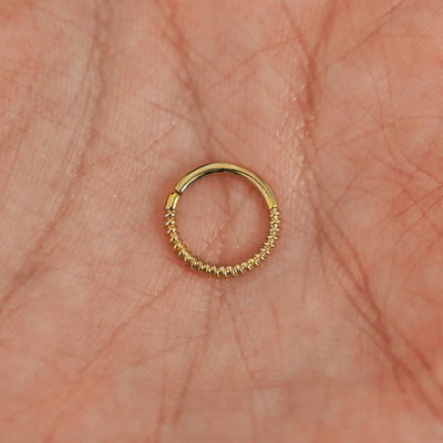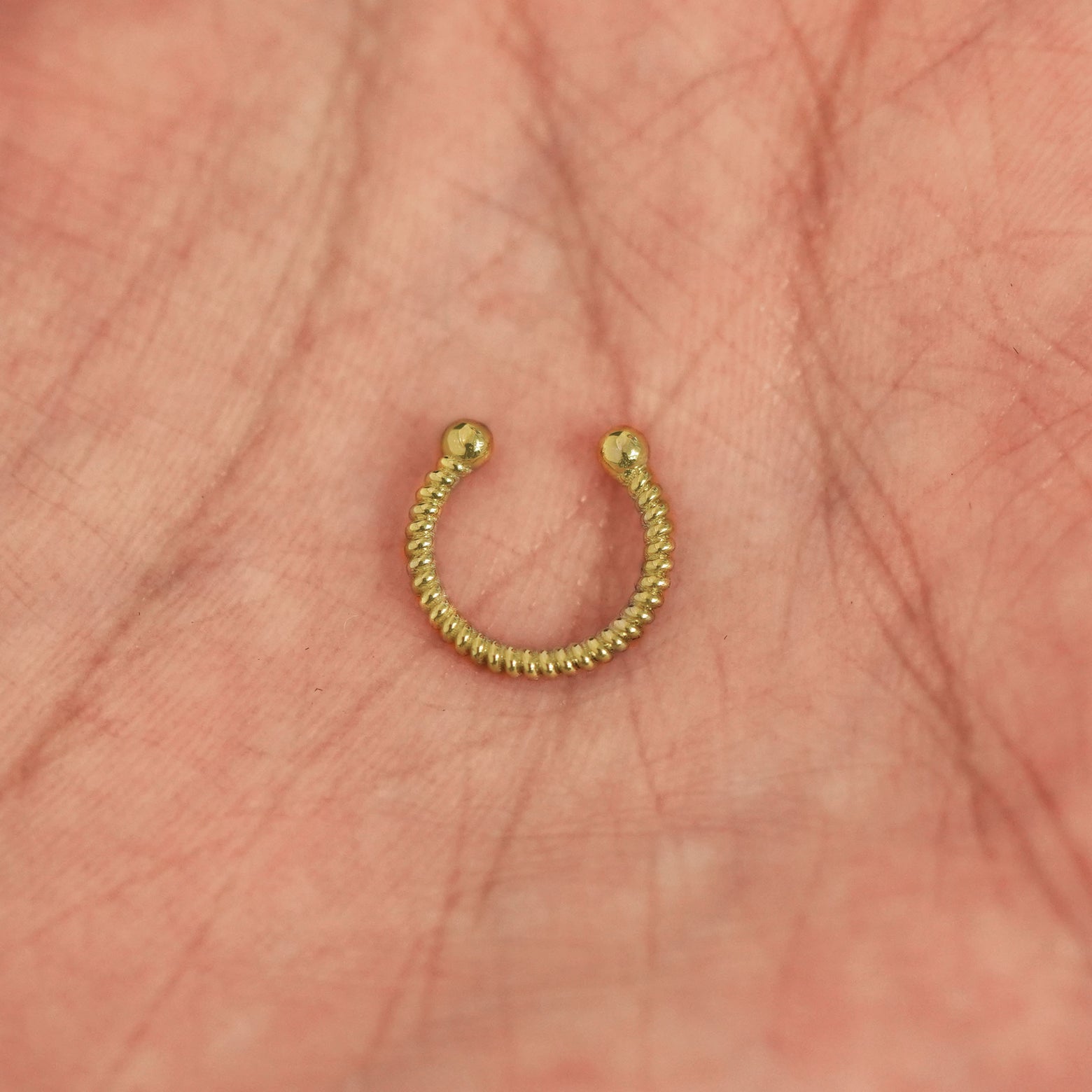 The twisting textured rope design of this septum ring catches the light to give your look a little extra sparkle. Crafted from solid 14k gold, this septum ring comes in both pierced and non-pierced options so anyone can wear it. Wear this seamless septum ring as an earring or in a daith, cartilage, or other piercing.